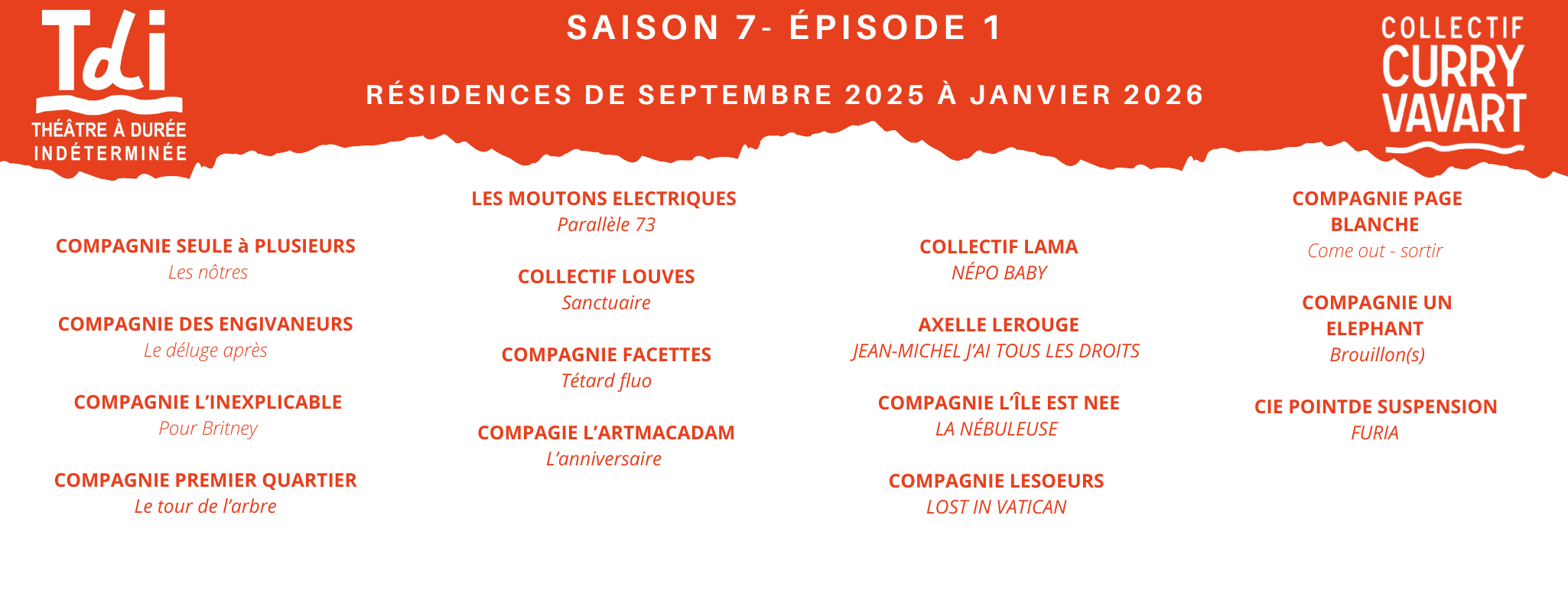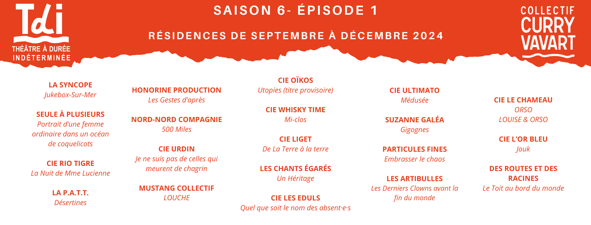 Compagnies et artistes Curry Vavart : AZA Cie Asile artistik Benjamin Candotti Besson Muriel Lefebvre Cie 25 Watts Cie un pied sur la planche Les mots voyageurs AG Compagnie Barbara Bellosta